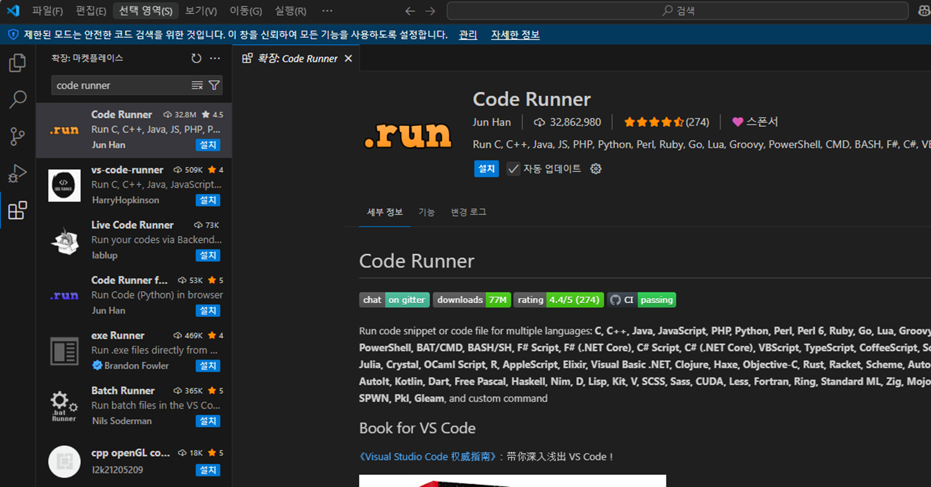- VS Code의 확장 프로그램 마켓플레이스에서 "Code Runner"를 검색하여 설치합니다13.