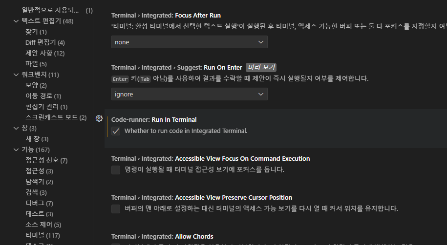 - "Run In Terminal" 옵션을 검색하여 체크합니다.